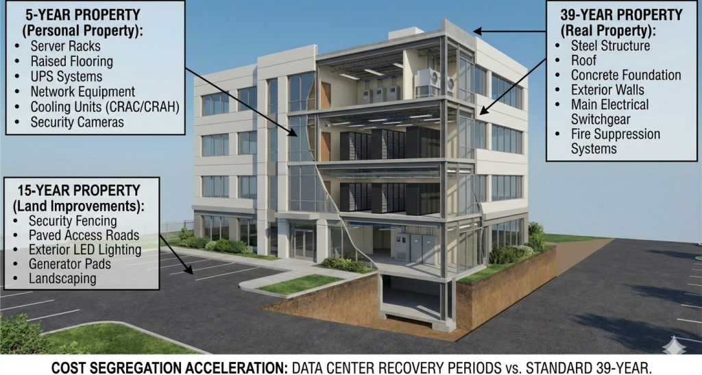 Data centers represent some of the most capital-intensive commercial real estate investments. Between specialized electrical systems, advanced HVAC and cooling infrastructure, backup power generators, fire suppression systems, and extensive interior buildouts, these facilities contain millions of dollars in depreciable assets.